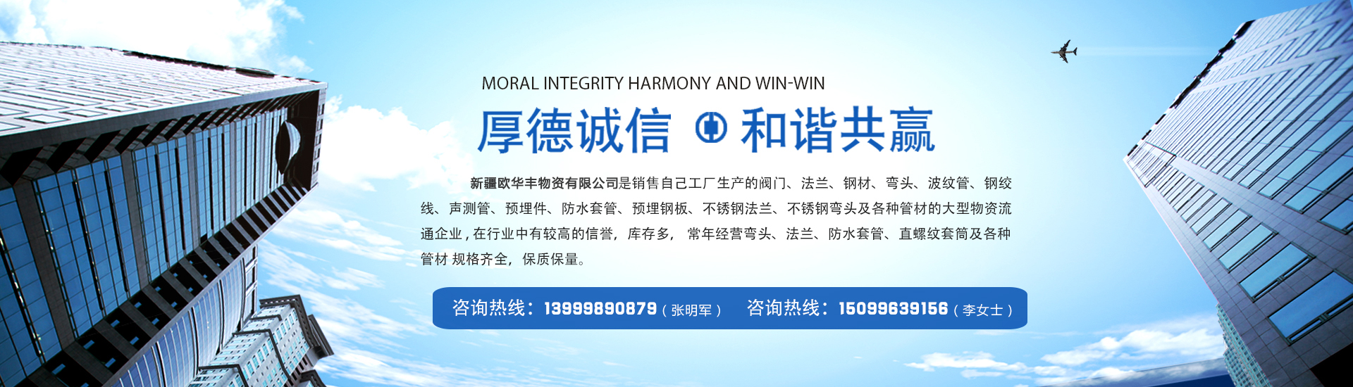 新疆歐華豐物資有限公司是銷售自己工廠生產(chǎn)的彎頭  法蘭  防水套管  及各種管材的大型物資流通企業(yè) , 在行業(yè)中有較高的信譽(yù),庫(kù)存多,常年經(jīng)營(yíng)閥門、法蘭、鋼材、彎頭、波紋管、鋼絞線、聲測(cè)管、預(yù)埋件、防水套管、預(yù)埋鋼板、不銹鋼法蘭、不銹鋼彎頭及各種管材 規(guī)格齊全,保質(zhì)保量。 公司一貫以: 服務(wù)上乘、質(zhì)量?jī)?yōu)質(zhì)、價(jià)格合理、客戶至上、服務(wù)周到、讓利客戶、薄利多銷為原則,誠(chéng)實(shí)守...